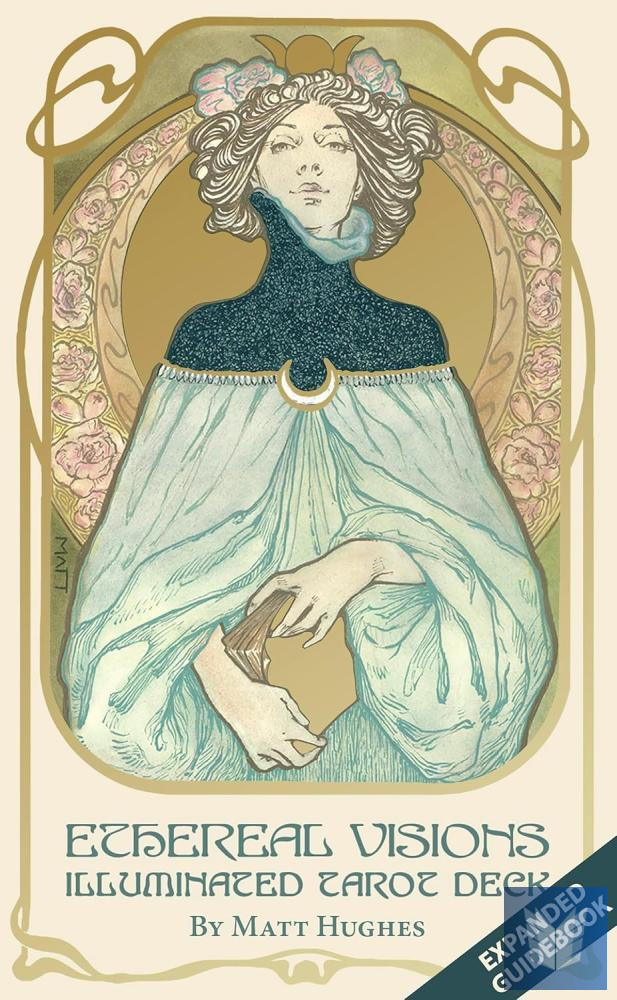 In creating Ethereal Visions Tarot, Matt Hughes has drawn inspiration from the Art Nouveau movement, adopting its distinctive style and meticulous approach to craftsmanship. The artist has also created two additional cards to supplement the traditional Major Arcana. Every detailed image in the 80card deck is hand drawn and colored. Each card is illuminated with gold foil stamping, to elegant effect. Includes a 48page booklet.
