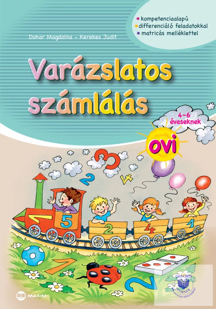 A Varázslatos helyesírásunk, környezetismeret, számoló, szöveges számoló, angol és német nyelv című sorozatunk újabb, Varázslatos számlálás és világunk című kötetei úgy orientálnak az iskola felé, hogy az óvodai tevékenységeket aszerint csoportosítják, hogy melyik iskolai tantárgy alapozásának tekinthetők. A gyakorlófüzetek kompetenciaalapú, differenciáló, játékos feladatokkal dolgozzák fel az adott korosztály számára ajánlott ismereteket. A Varázslatos számlálás ovi 4–6 éveseknek foglalkoztató munkafüzet a matematikai kompetencia kialakításában nyújt hatékony segítséget. A középső csoportos gyerekek már biztonsággal használják a ceruzát, kezd kialakulni a számfogalmuk, jól tájékozódnak az ötös számkörben, és egyszerű feladatokat is képesek elvégezni. Az iskolára való ráhangolást a kicsik számára sikerélményt jelentő játékos tevékenységekkel, például rajzolással, színezéssel, matricaragasztással érjük el. Kiadványainkat óvodai, iskolai és otthoni gyakorlásra egyaránt ajánljuk.
